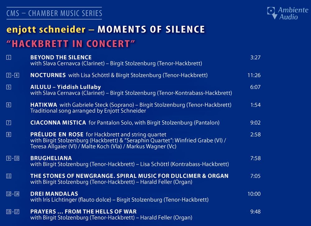 Neue Musik, - für "Hackbrett" konzertant, - ein Instrument, das nicht nur aus der Volksmusik bekannt ist, sondern - vielen Klassik-Hörern unbekannt - seit Renaissance und Barock auch zur Kunstmusik gehört. Musik der Stille, intim, zart und in ungehörte Räume führend. Birgit Stolzenburg spielt mit hochkarätigen Kammermusik-Partnern: mit Klarinette, flauto dolce, Sopran, im Hackbrett-Duo, mit Orgel, mit Streichquartett... diese CD mit solch exquisiten Stimmungen und Besetzungen ist ein Unikat der Musikgeschichte, - "Hackbrett" in völlig neuen Kontexten.