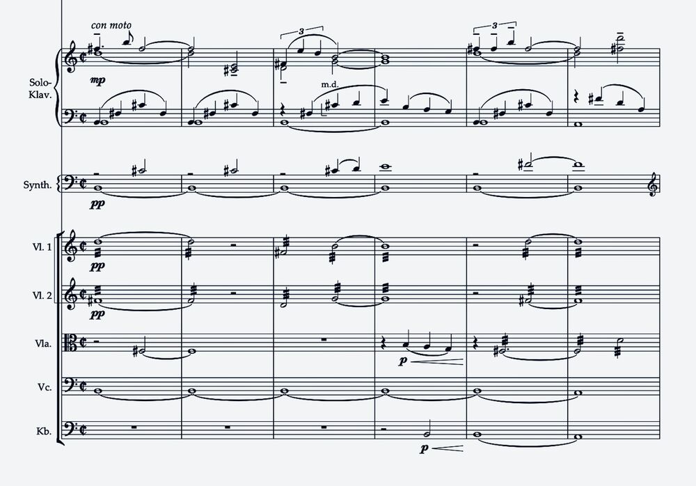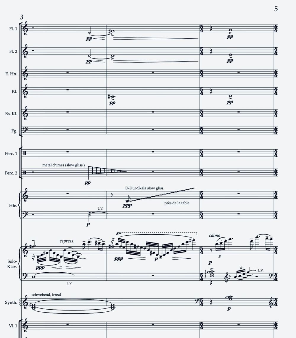 Instrumentation: Soloklavier, 2 Flöten, Englisch Horn, Klarinette, Bassklarinette, Fagott, Percussion 1+2, Harfe, Synthesizer ad libitum, Streichorchester (mit Solovioline).