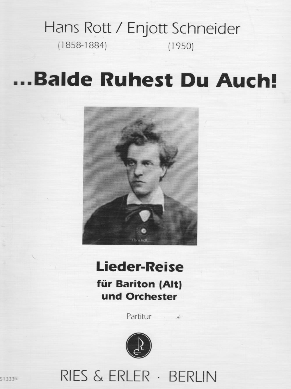 Introduction: A cycle with five piano songs of the Bruckner student and Mahler coeval Hans Rott (1858-1884) who died young and was long misjudged. However, nowadays the musical world is fascinated by Hans Rott. With musical commentary (prologue, interludes, epilogue in contemporary idiomology), Enjott Schneider guides the listener through the piano songs of Hans Rott, songs that have been influenced greatly by a longing for death and withdrawal. The songs are orchestrated carefully as their original expressivity is supposed to remain unchanged. The songs are: Wanderers Nachtlied (Hiker's Night Song) (J.W. von Goethe), Das Veilchen (The Violet) (V. Zusner), Vergissmeinnicht (The Forget-me-not) (V. Zusner), Zwei Wünsche (Two Wishes) (unbekannt), Der Sänger (The Singer) (J.W. von Goethe). CD recording with Michael Volle (baritone), Munich Symphony Orchestra, cond.: Hansjörg Albrecht. - - The commentary contrasts the songs and their movement of the late romanticism with a sound language in free tonality, with clusters, high glistening continuous tones (that cover Hans Rott's quotations like a veil), along with subtle sounds that are fragile or show excessive bursts and always refer to the 'death' and 'insanity' of Hans Rott. The songs are put in context with an imaginary shadow world and therefore receive three-dimensional contours. What keeps everything together is a central motif that is also reflected in the vocals: „Warte balde ruhest du auch! (Wait, soon you will rest as well!), a motif that is exposed specifically in the prologue and in the epilogue.