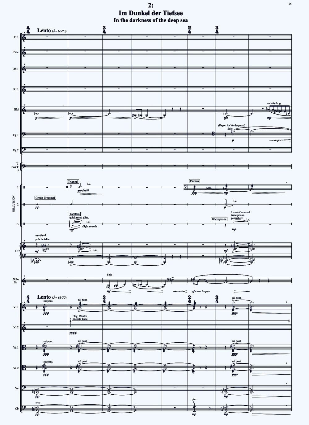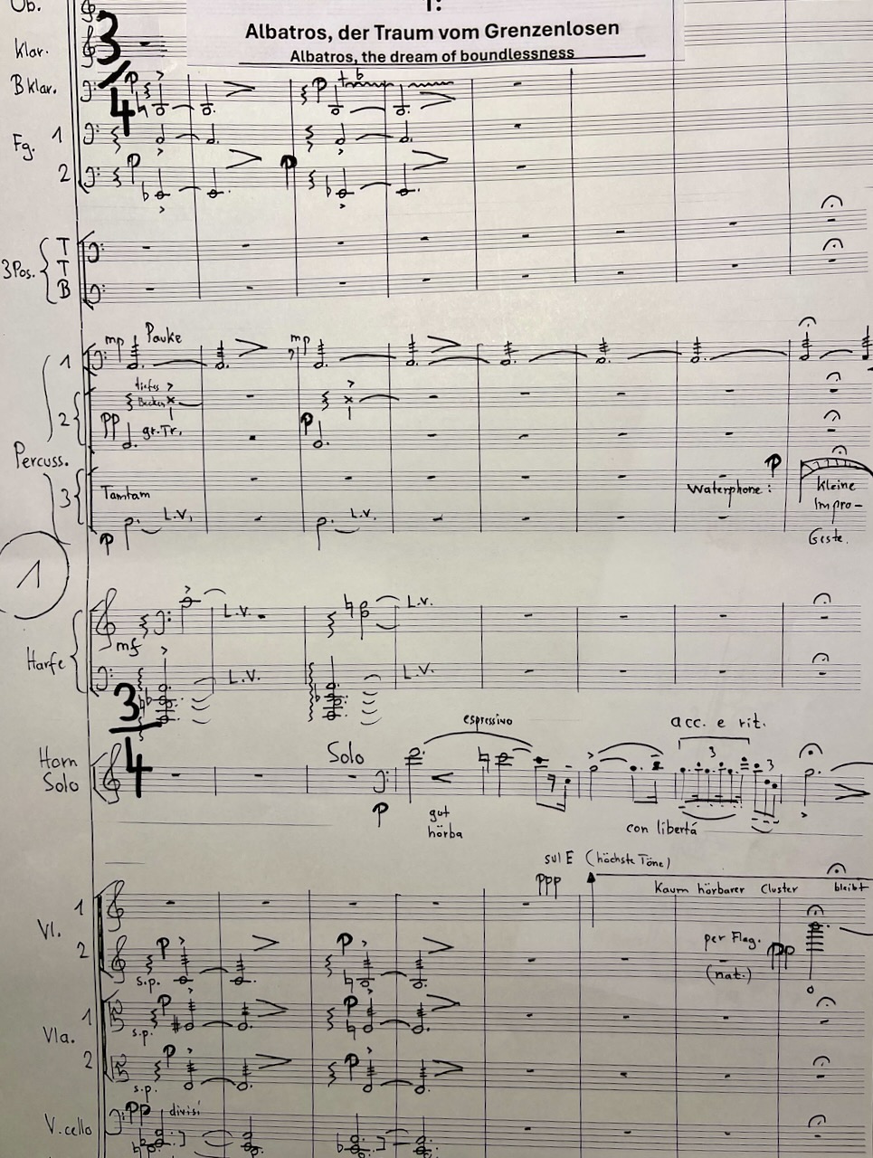 Stylistically, it lies somewhere between postmodernism, sound research and the surrealism of recent film music. The focus is on extra-musical messages such as respect for creation and nature, ecological responsibility as a hymn-like call not to destroy the ocean-blue globe any further. Nationalism and egoism are countered by planetary coexistence as a necessary paradigm shift. These themes are to be conveyed above all by the solo horn, which is required to be technically virtuosic as well as melodically expressive.