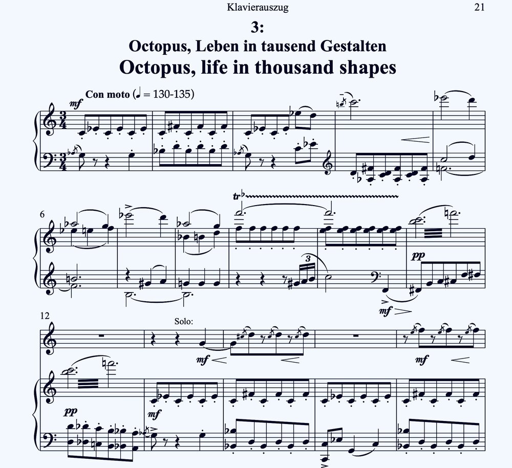 Movement 3: In recent years, the octopus has gained an extremely positive image thanks to sensational research and observation: on the one hand, it is the most alien creature on the planet, yet with its fascinating intelligence (eight brains in each of its arms) and even emotional competence, it is quite close to humans. The music captures this complexity of octopus existence and integrates the soloist into a sensually confusing network with the orchestra.