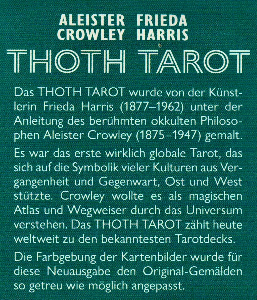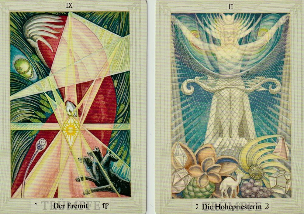Among the over one hundred different ‘decks’ (each with their own symbols and images), the English tradition of the ‘Hermetic Order of the Golden Dawn’, led by the Kabbalist Aleister Crowley, was able to establish itself; its visualisations were created by the mediumistic artist Frieda Harris. It is to these that reference is made here.