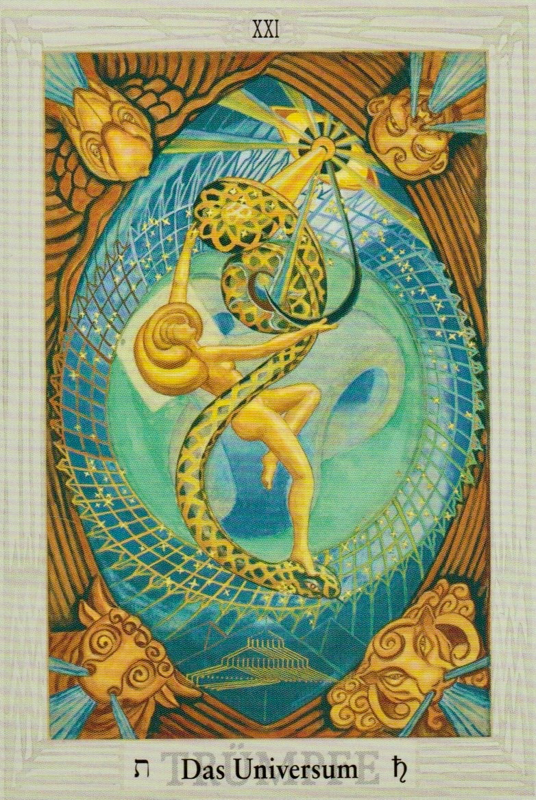 THE UNIVERSE is the last of the 22 cards of the Arcana, associated with the final letter Tau. Together with the first letter Aleph, it forms ‘Ath’, meaning essence: the completion of the great work, in harmony with the whole, a dance of liberation as a ‘Yes!’ to unconditional universal love. A finale of peace.