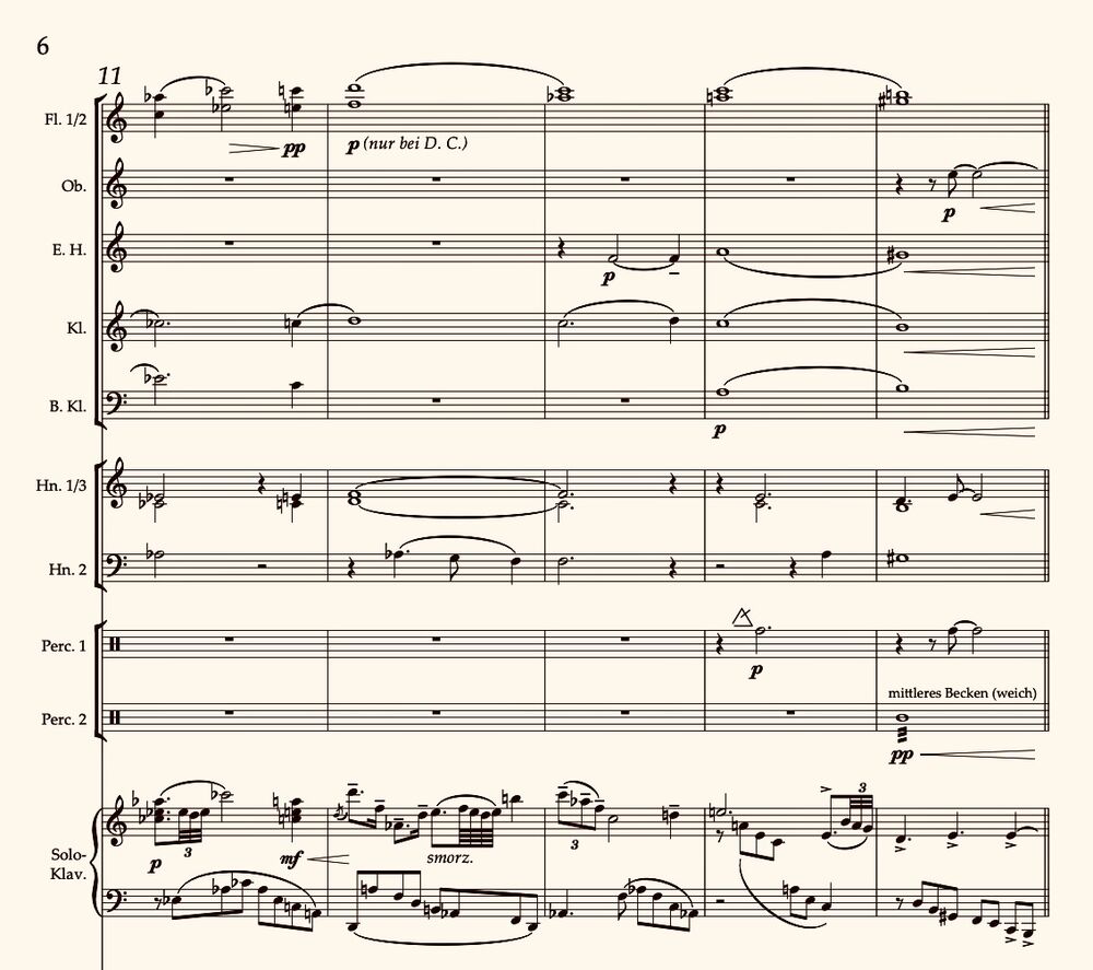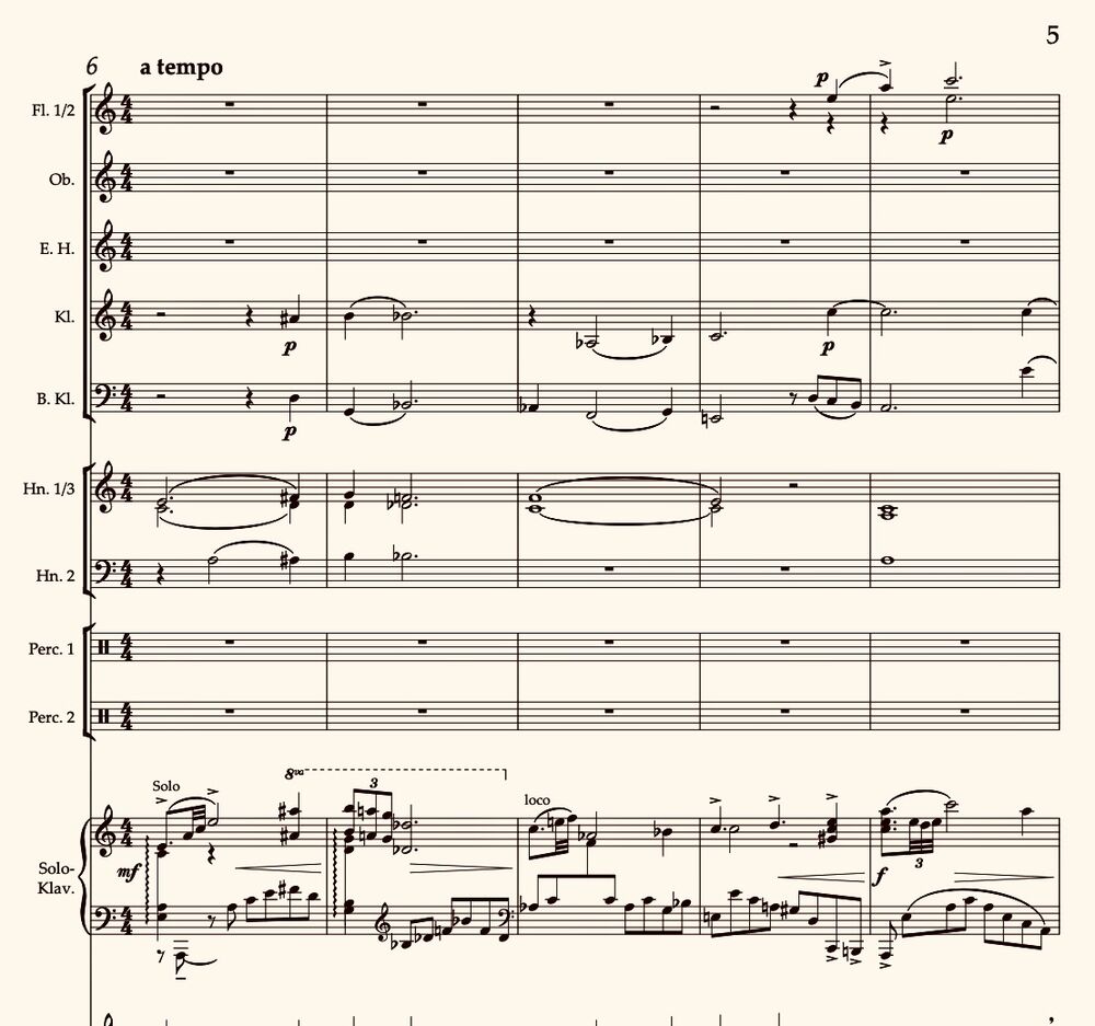 Besetzung: Soloklavier, Flöte, Oboe, Englischhorn, Klarinette, Bassklarinette, Horn 1-3, Percussion 1+2, Synthesizer, Streichorchester