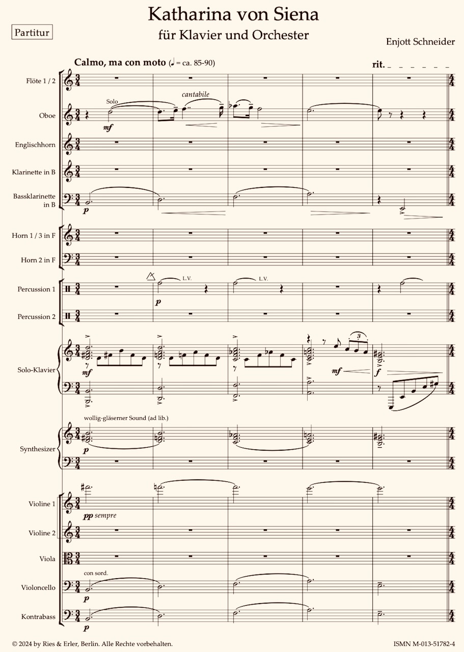 Vorwort: Catarina von Siena (1347-1380) war eine in Italien sehr populäre Heiligenfigur, Mystikerin. Dominikanerterziarin und italienische Landespatronin. Ihr Leben war von Leid und geduldiger Hingabe an die Menschen gezeichnet und ist von vielen Legenden gezeichnet, so daß sie schon elf Jahre nach ihrem Tod heilig gesprochen wurde. Musikalisch changieren sanfte Stimmungen mit auch kraftvolleren Passagen. Die Musik stammt aus einem Film von 1984 (Regie: Jürgen Grundmann), ursprünglich Klavier und Elektronik, dann. 2025 für Klavier und Orchester umgeschrieben.