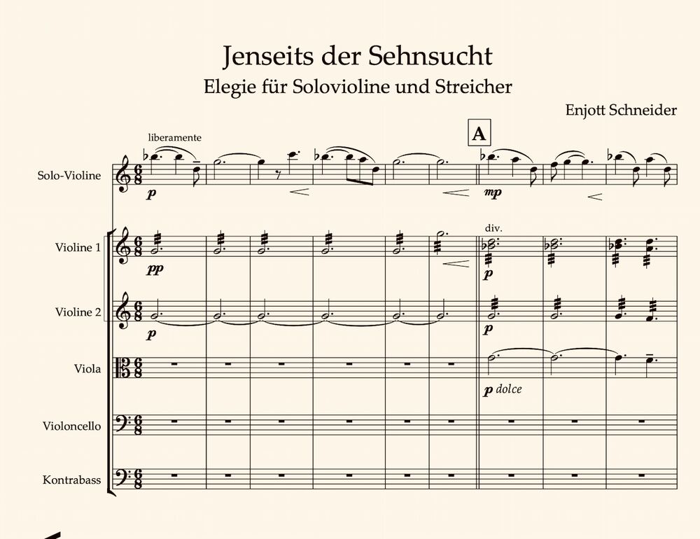 Diese schlichte namenlose Abspannmusik aus dem Spielfilm "Ohne Dich" hat - für mich sehr geheimnisvoll - die Menschen immer so berührt und "jenseitig" gemacht, dass wiederholte Nachfragen mich bewogen, es im Verlag Ries & Erler Berlin als konzertante Einzeledition zu instrumentieren und den Namen ELEGIE. JENSEITS DER SEHNSUCHT zu geben. Weitere Verwendungen des Motivs in anderen Werken hatten ebenfalls diesen Zaubereffekt der Einfachheit.