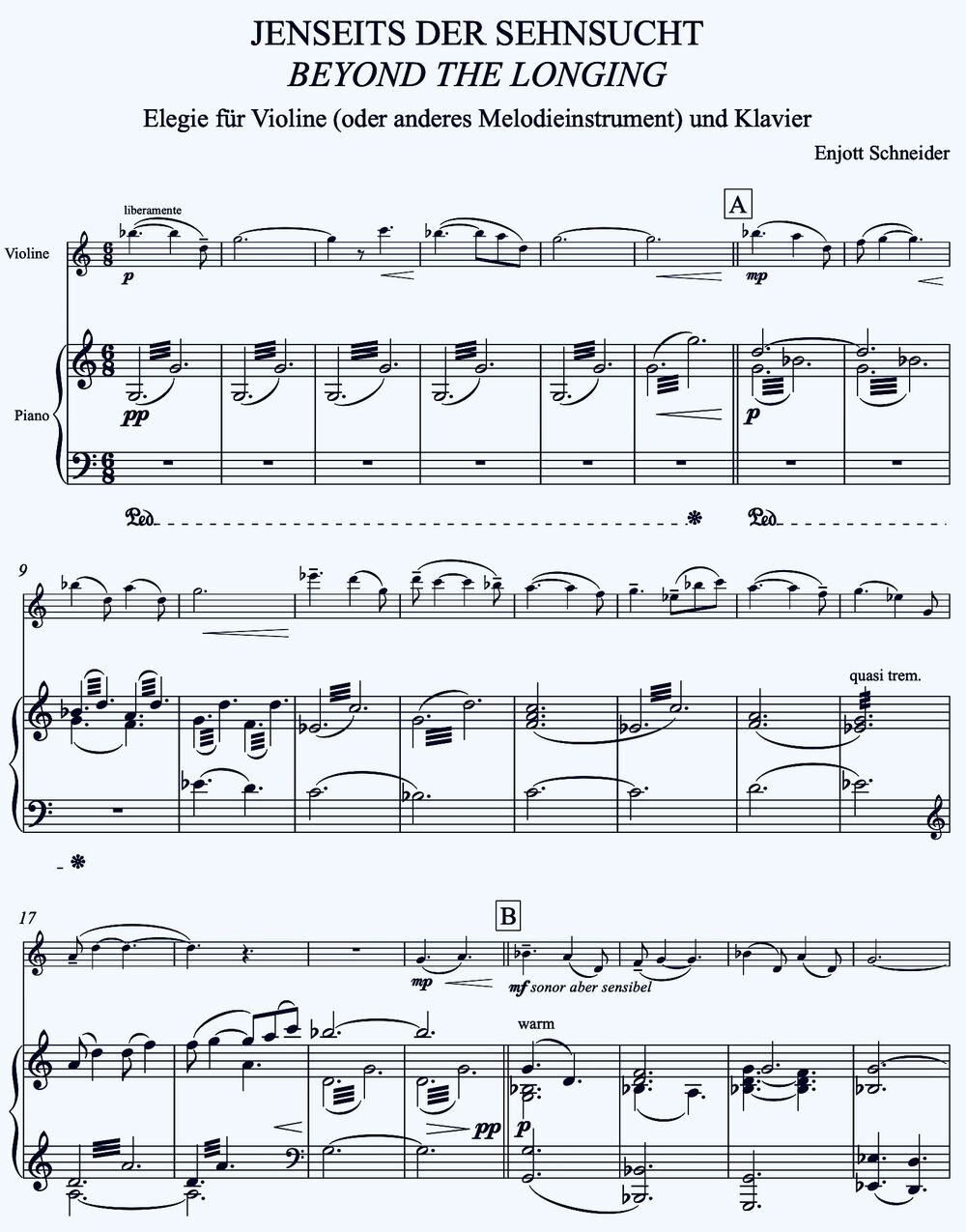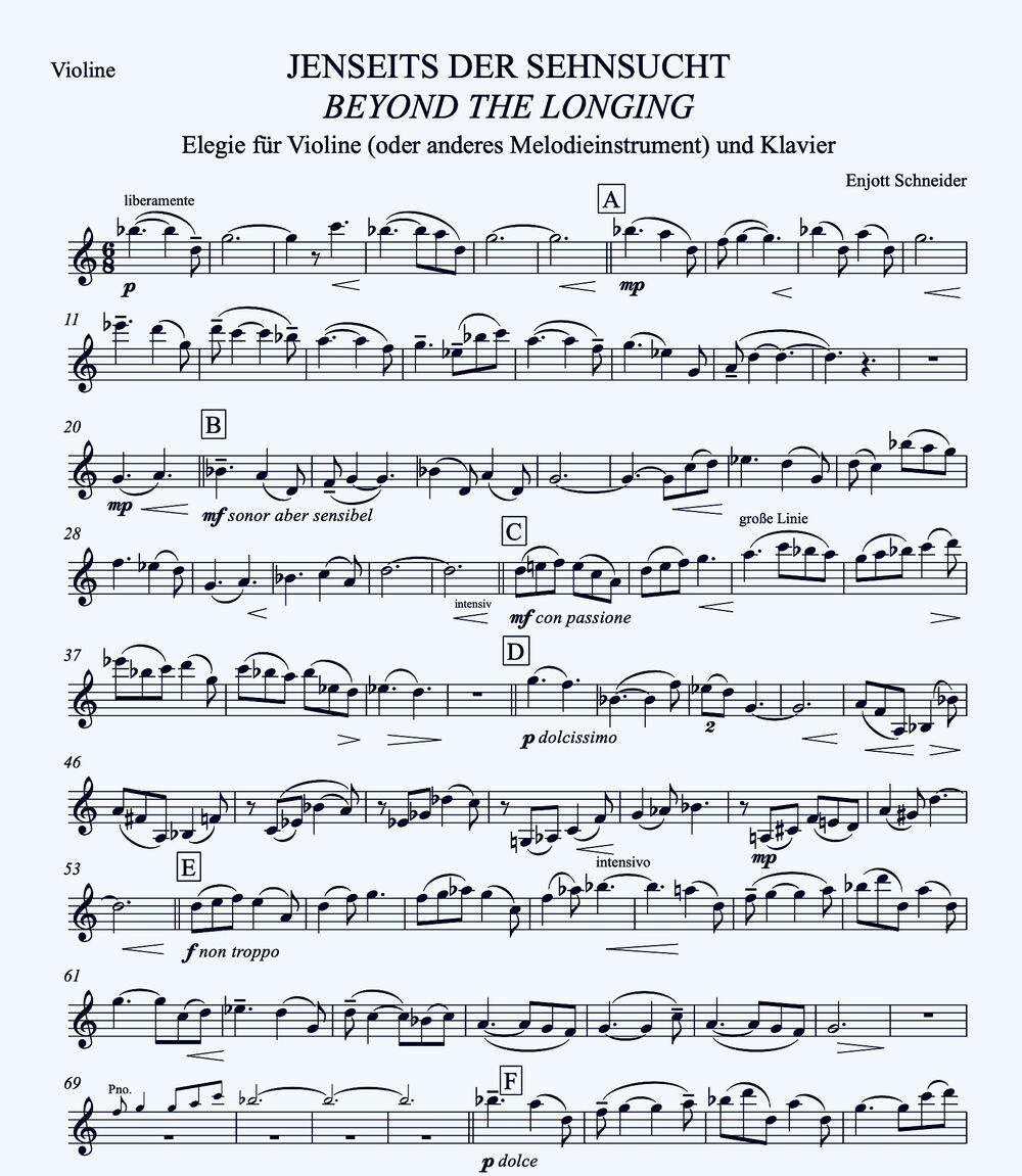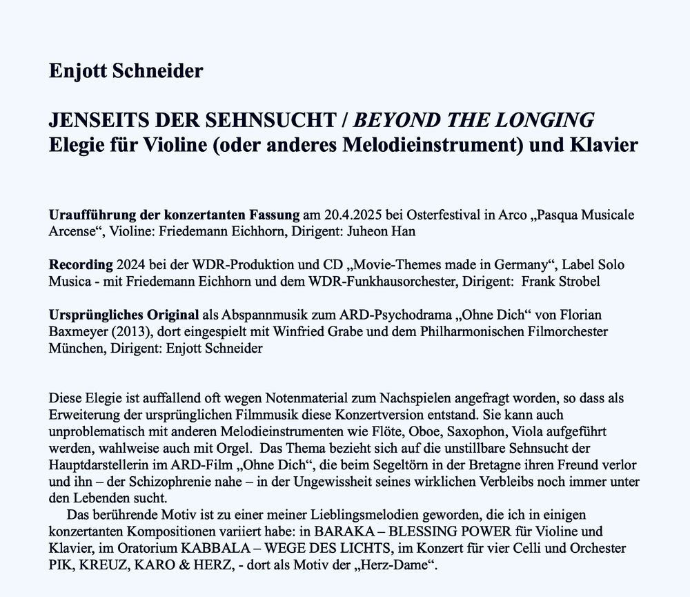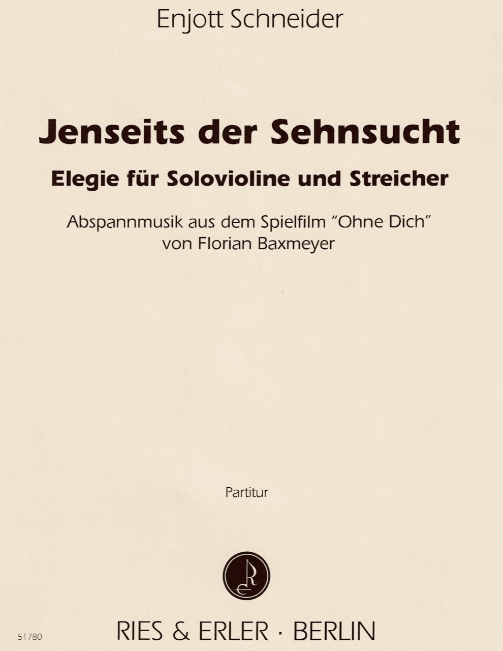 Vorwort: Diese ELEGIE „JENSEITS DER SEHNSUCHT“ / „BEYOND THE LONGING“ für Violine und Streichorchester ist sehr filmmusikalisch: Sie entstand als Abspannmusik zum Psychodrama "Ohne Dich" von Florian Baxmeyer 2013 für Odeon-TV Wiesbaden im Auftrag von Degeto/ARD. Martina (gespielt von Stefanie Stappenbeck) verliert bei einem Segelurlaub in der Bretagne mit misteriöser Plötzlichkeit ihren geliebten Freund. Die Suche nach dem Vermissten oder Toten wird zu einem Alptraum zwischen Hoffen, Halluzinieren und einer Sehnsucht, die in Wahn umschlägt.