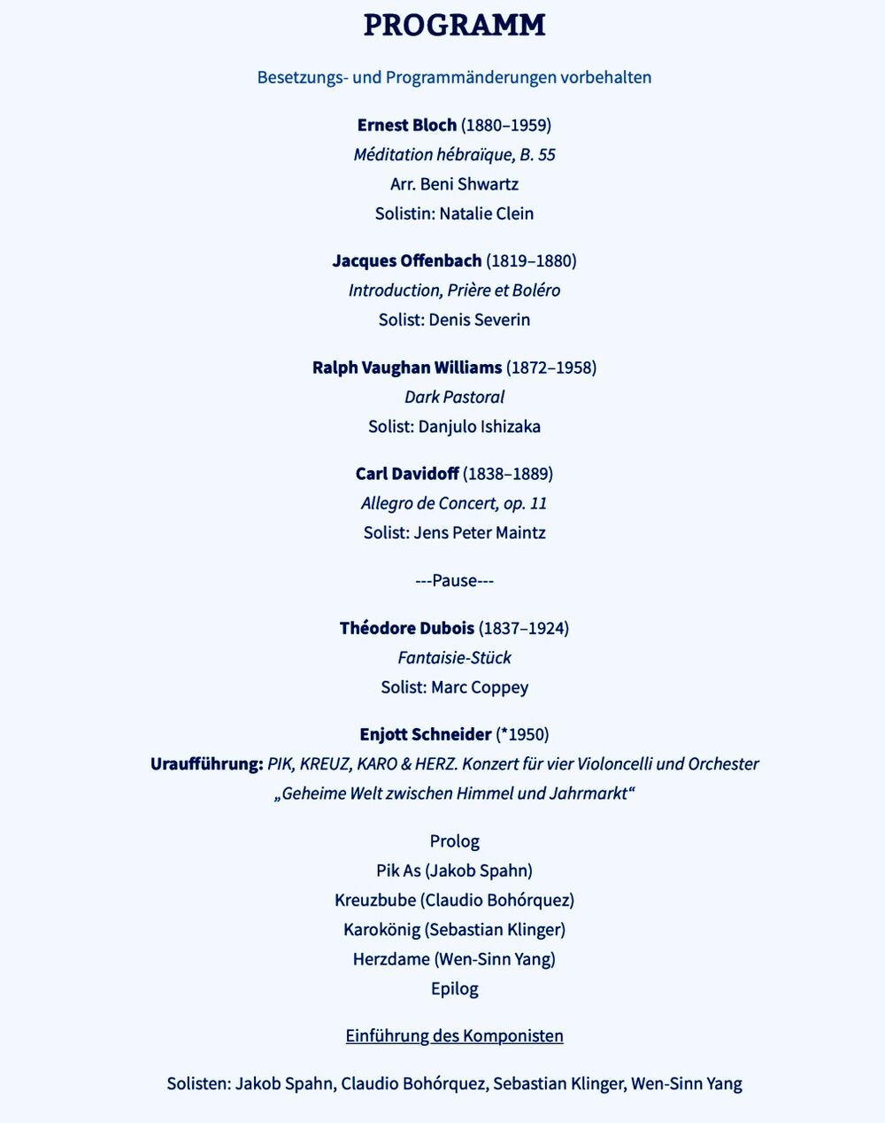 Uraufführung Interpreten: Premiere am 29. Oktober 2025 19:00 Halle Bühl 2, im Konzert „Symphonische Meisterklänge. Orchesterkonzert der Dozenten“ der Cello Akademie Rutesheim.