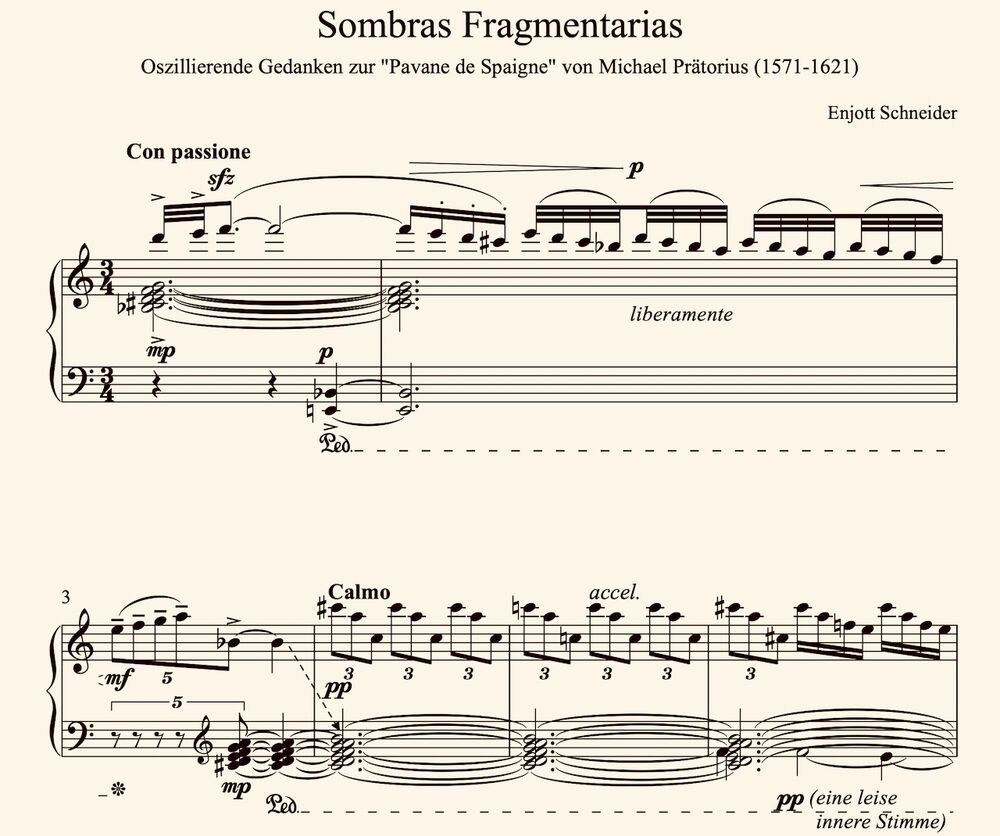 Das Werk entstand für das „Projekt Michael Prätorius“ des Komponisten Stefan Heucke. Er hatte seine komponierende Kollegenschaft eingeladen, als Hommage an Michael Prätorius (1571-1621) dessen 450. Geburtstag und 400. Todestag sich gleichzeitig jährt, eine Paraphrase zur „Pavane de Spaigne“ aus der Sammlung „Terpsichore“ zu schreiben. In meinen „Sombras Fragmentarias“ („Fragmentarische Schatten“) war die farbige Harmonik mit den auffälligen Querständen wie zum Beispiel bei den Akkordverbindungen A-Dur–C-Dur oder F-Dur-D-Dur das inspirierende Moment. Chromatisches Oszillieren führte zu den oszillierenden Gedanken, wobei Melodiezitate und Skalen mit übermäßigen Sekunden ein spanisches Kolorit evozieren.